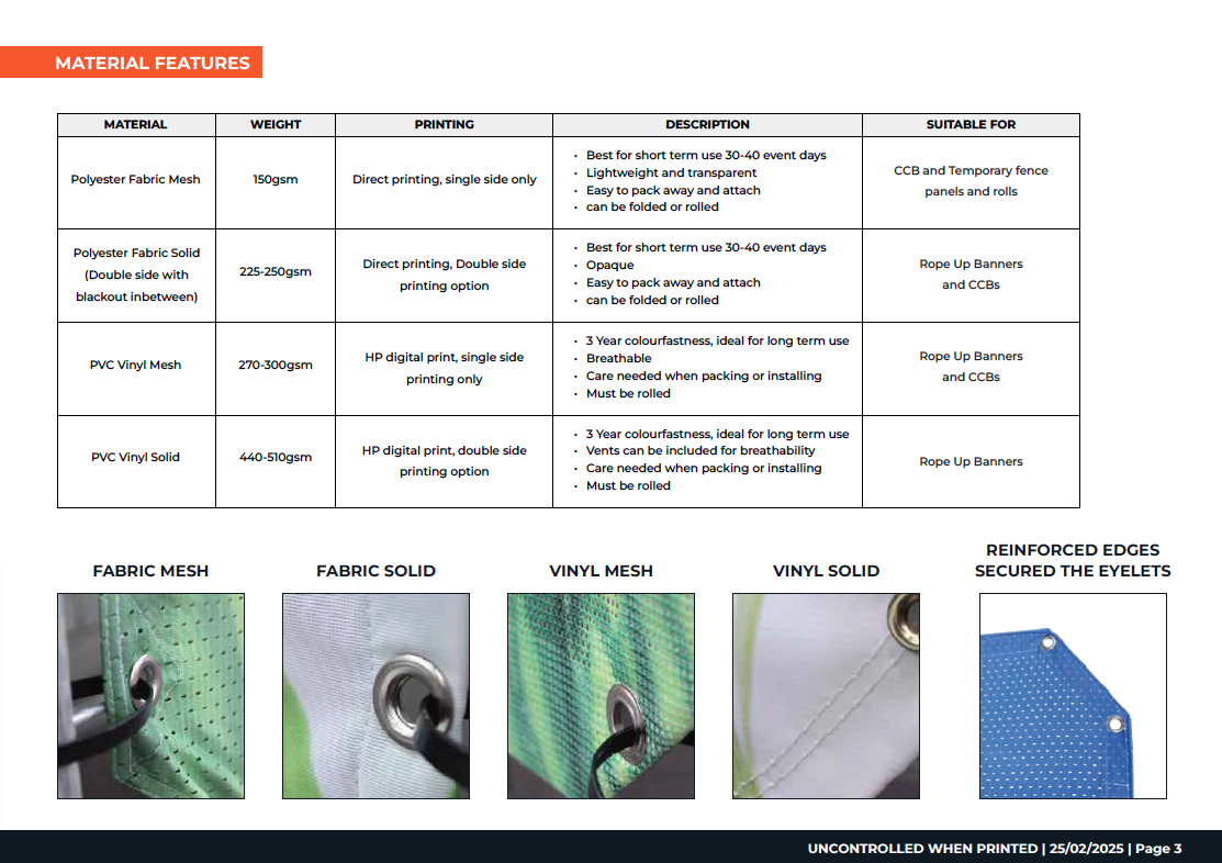 PVC (Vinyl) has a flexible rubber feel to it and a smooth/matte finish. It is a heavier and more durable material that is easy to wipe clean. The UV digital print will last 3 years. Best for long term or repeated use, however, it can sometimes get creased and damaged if not stored properly. Fabric and fabric mesh is used outdoors and is ideal for single-use or limited multiple uses as they are dye sublimation printing. The printing is sharp and vibrant, with a satin finish. A benefit of fabric solid and fabric mesh is that they are lighter than PVC and easier to store or transport because they take up less space when packed up. Fabric and Fabric Mesh also present better for subsequent uses because they are easily folded and won’t hold creases.