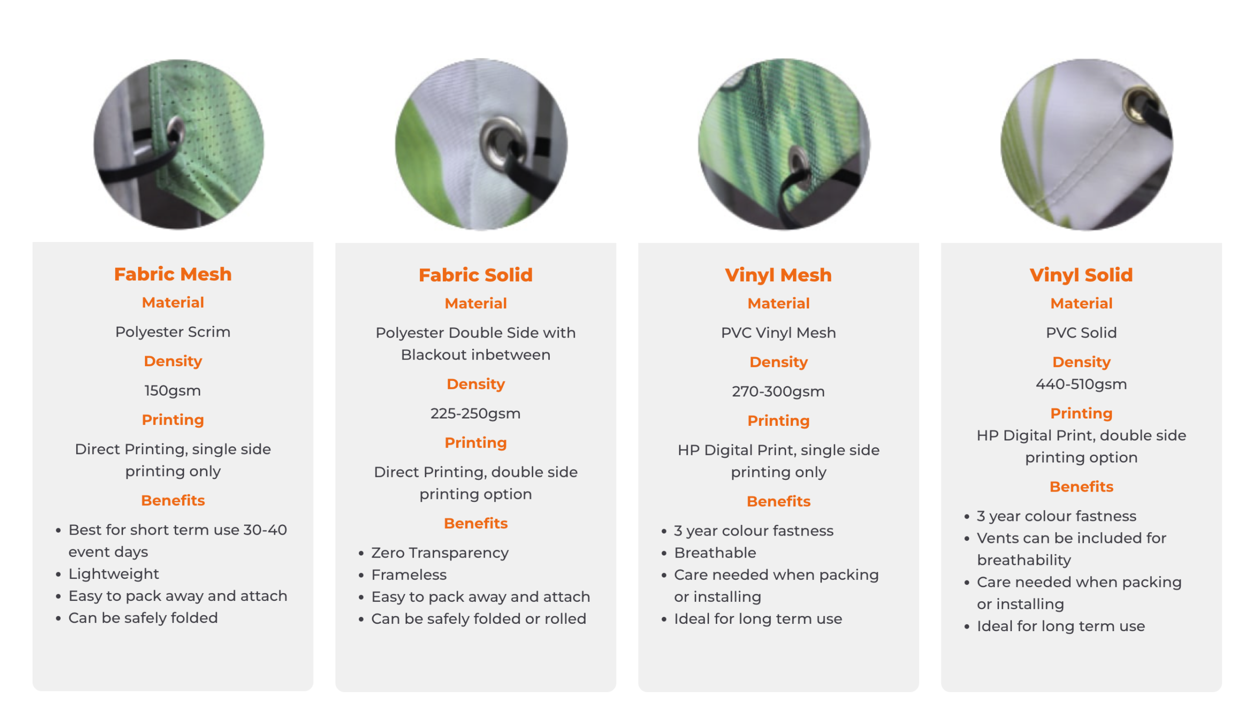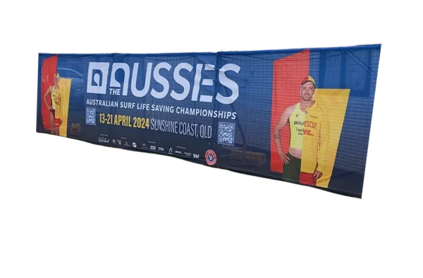 PVC (Vinyl) has a flexible rubber feel to it and a smooth/matte finish. It is a heavier and more durable material that is easy to wipe clean. The UV digital print will last 3 years. Best for long term or repeated use, however, it can sometimes get creased and damaged if not stored properly. Fabric and fabric mesh is used outdoors and is ideal for single-use or limited multiple uses as they are dye sublimation printing. The printing is sharp and vibrant, with a satin finish. A benefit of fabric solid and fabric mesh is that they are lighter than PVC and easier to store or transport because they take up less space when packed up. Fabric and Fabric Mesh also present better for subsequent uses because they are easily folded and won’t hold creases.
